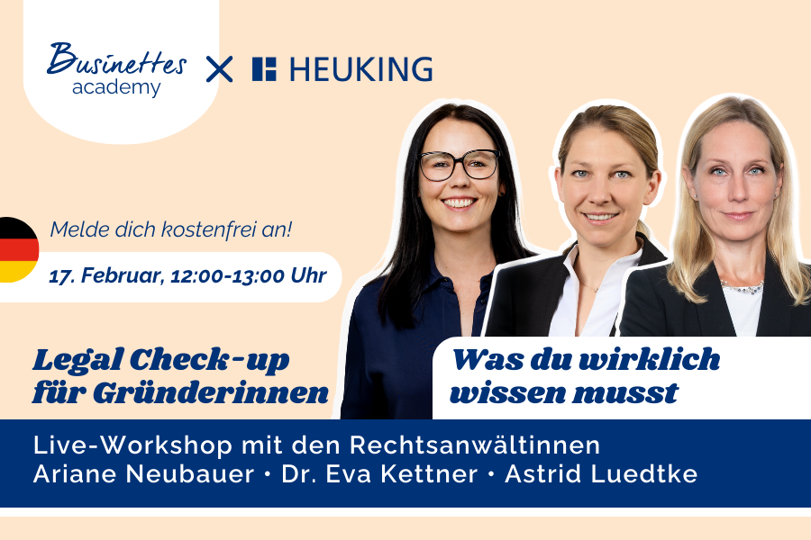 In dieser Businettes Academy bekommst du einen kompakten, praxisnahen Legal Check-up für dein Business. Gemeinsam mit erfahrenen Anwältinnen von HEUKING schauen wir auf genau die Fragen, die Gründerinnen im Alltag wirklich beschäftigen – verständlich erklärt und ohne juristisches Fachchinesisch.